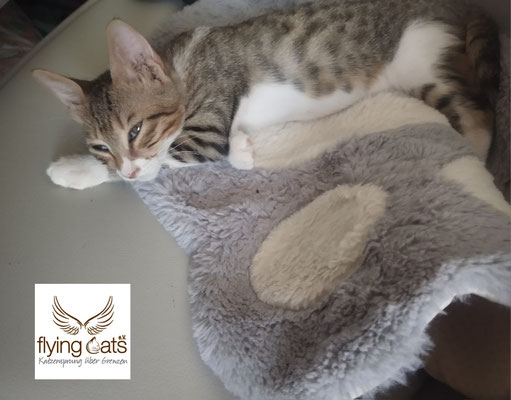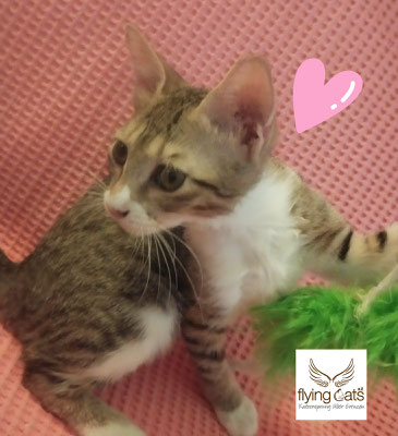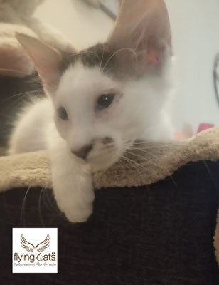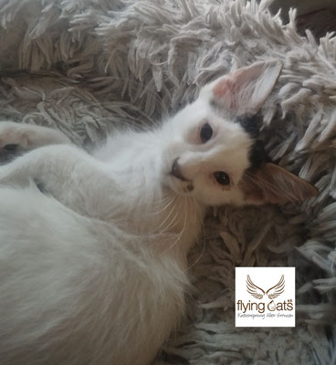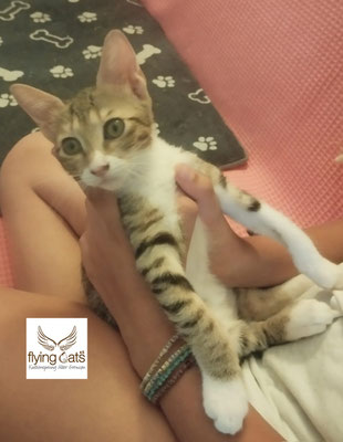 Er kam dann in eine Pflegestelle, wo er zusammen mit Bella, die ebenfalls ein Fundkitten war, solange gepflegt wurde, bis sie nun zusammen aus Griechenland nach Deutschland reisen durften.