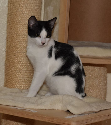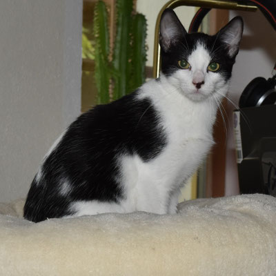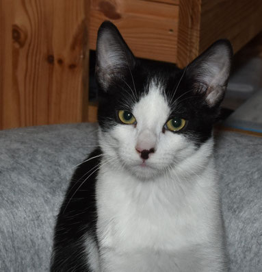 Bella hat nach einer Bindehautentzündung ein minimal tiefer liegendes Auge, das sie aber nicht in ihrer Sehfähigkeit beeinträchtigt. Dafür punktet sie umso mehr mit ihrem wunderschön glänzenden schwarzen Pantherfell und mit ihrer neugierigen und verschmusten Art.
